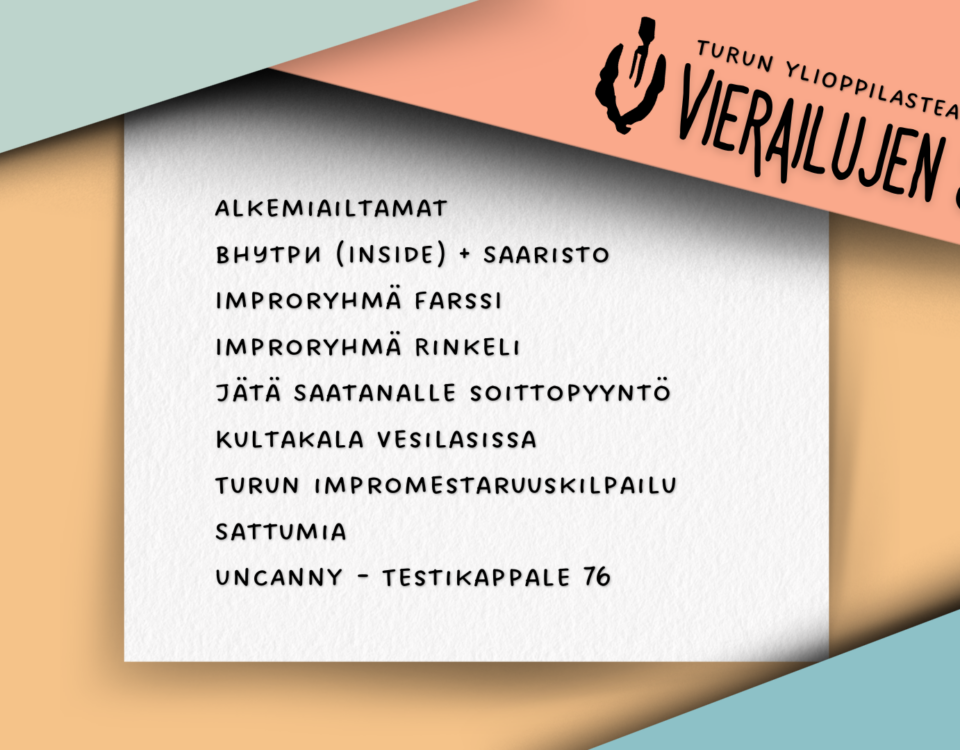 Yhdeksän eri esityskokonaisuutta valtaavat TYT:n näyttämöllä syyskuusta joulukuuhun 2025. Tarjolla on muun muassa poikkitaiteellista performanssia, nukketeatteria, improvisaatiota, nykytanssia, klovneriaa, naamioteatteria ja monologi.